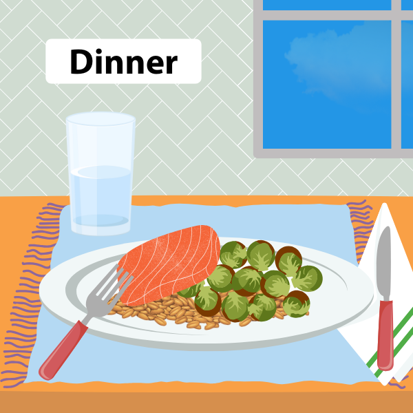 Example dinner: 3 oz. salmon, ½ cup farro, and roasted brussels