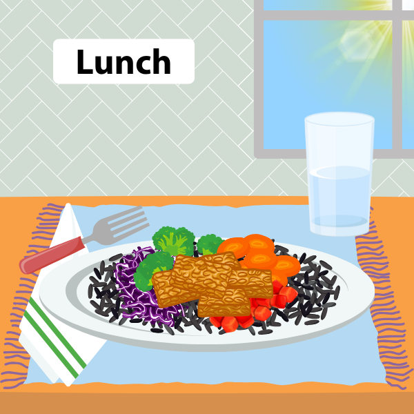 2 cups stir fry veggies, 3 oz sauteed tempeh, and ½ cup forbidden rice
