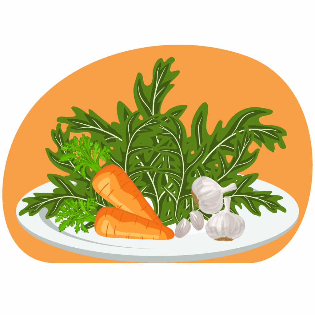 - Beta-carotene in bright orange and dark green colors of carrots and leafy vegetables